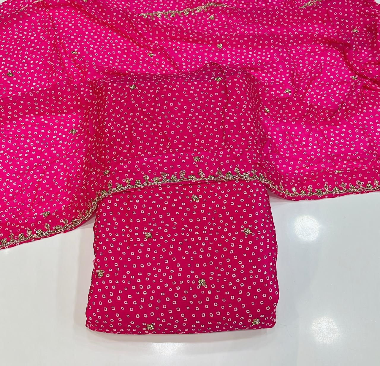Bright and vibrant, this rani pink Bandhani suit set is adorned with traditional white prints and delicate golden detailing. The matching dupatta with an embroidered border makes it a festive favorite for weddings, celebrations, and special occasions.